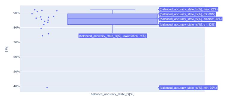 Um das Ergebnis besser zu verstehen, können wir uns ein Boxplot ansehen, das die Metriken für einzelne Haushalte und die statistischen Indikatoren für den gesamten Datensatz zeigt. Hier betrachten wir die Genauigkeit der Wärmepumpen-Erkennung (balanced_accuracy_state_ts[%]).